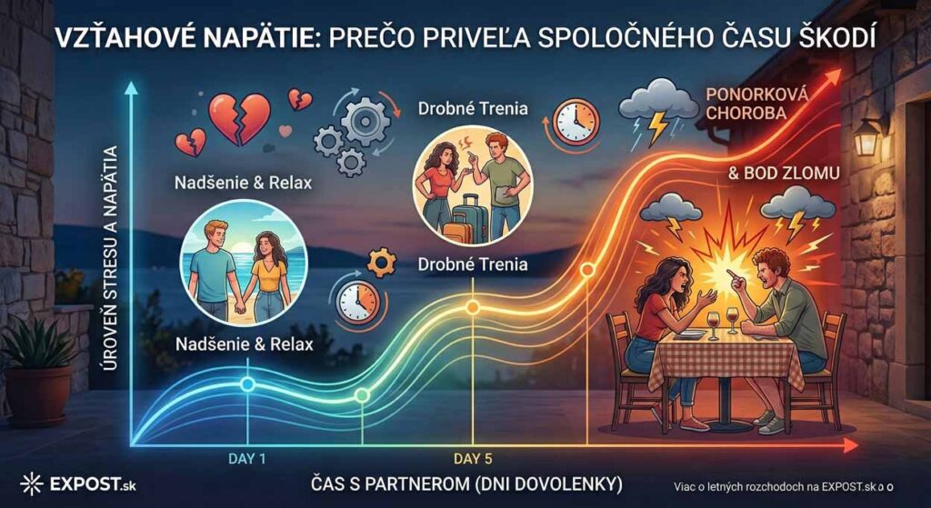 Psychológia vzťahov hovorí o takzvanom „efekte veľkých očakávaní“. Celý rok fungujeme v rutine – práca, deti, domácnosť, rýchle večere. Problémy zametáme pod koberec, pretože „nie je čas ich riešiť“. Dovolenka je vnímaná ako magický liek. Veríme, že akonáhle uvidíme more, všetky hádky utíchnu a my budeme opäť tými zamilovanými ľuďmi z prvej fotky v galérii.